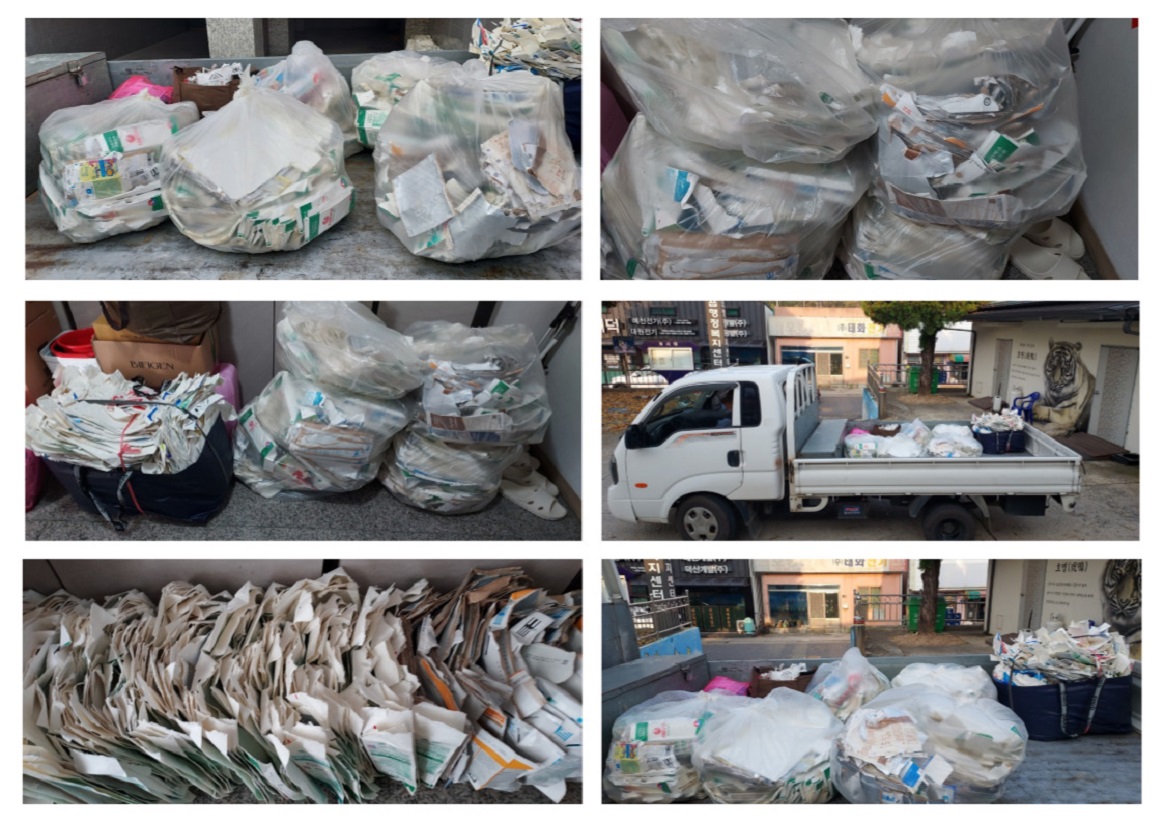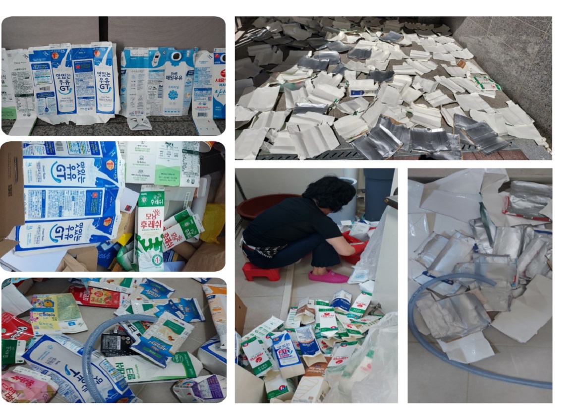 우유팩이나 쥬스팩은 내부에 플라스틱 코팅이 되어 있어 일반 종이류와 달리 별도로 분리배출해야 하는데 아파트 내 쓰레기장을 가보면 인식이 부족하여 여전히 종이와 함께 버리고 있습니다.