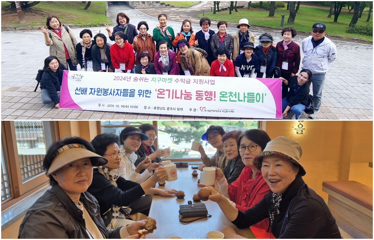 이후 판매수익금은 선배 자원봉사자들을 대상으로 그간의 노고에 감사를 전하고, 힐링의 시간을 함께하는 ‘온기나눔 동행! 온천나들이’를 진행했습니다. 충청남도 공주시 일대에서 무령왕릉과 왕릉원 탐방하고, 온천 체험과 더불어 공주한옥마을에서 전통문화 체험을 하며 가을풍경을 만끽하며 건강과 힐링의 시간을 보냈습니다. .