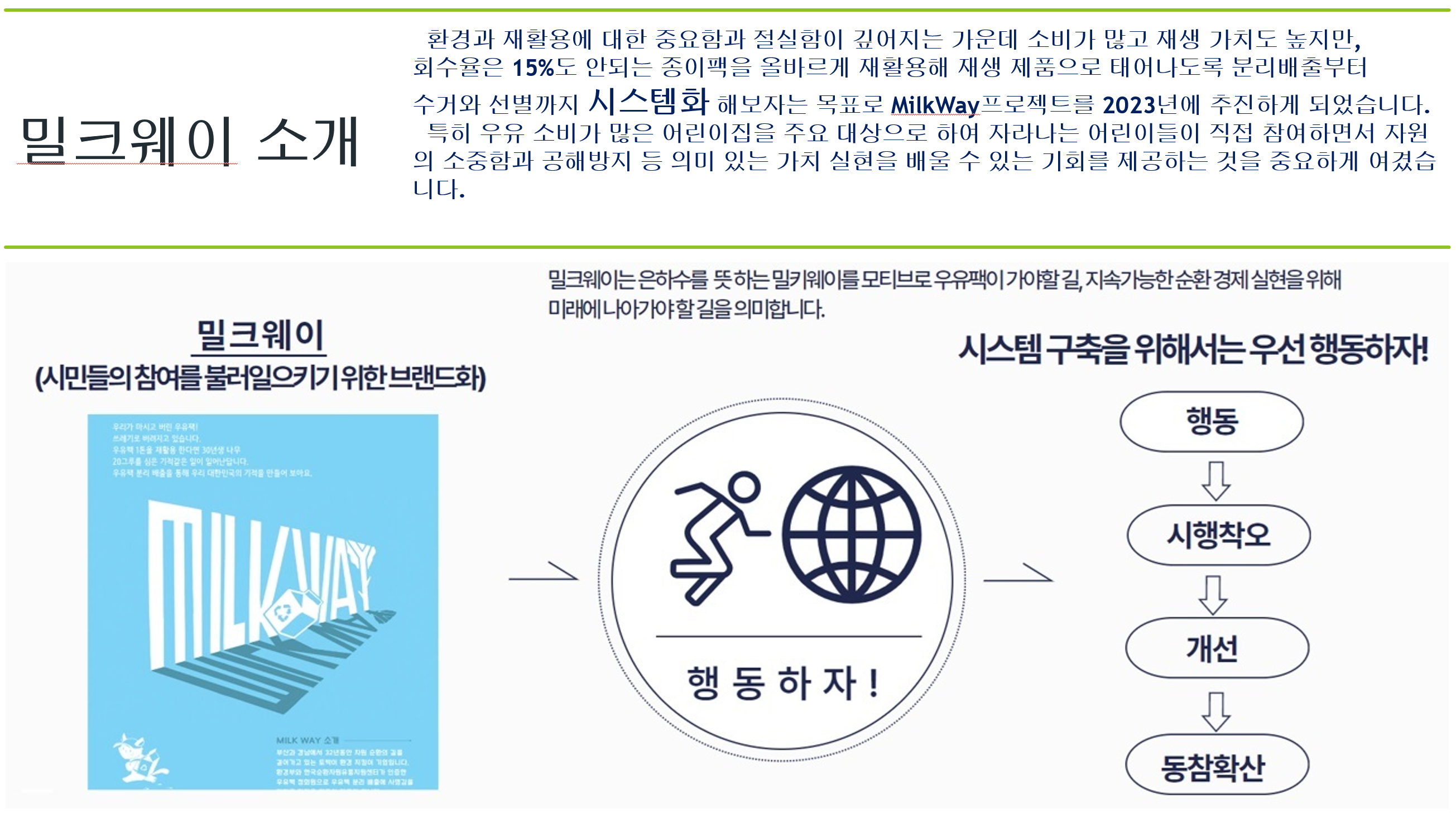 밀크웨이는 우리 국민 모두가 자원의 소중함을 알고 그것을 어떻게 올바르게 재활용할 수 있을지, 그리고 그것을 위해 어떻게 행동해야 하는 지를 알 수 있도록 최선을 다해 정진하겠습니다.
