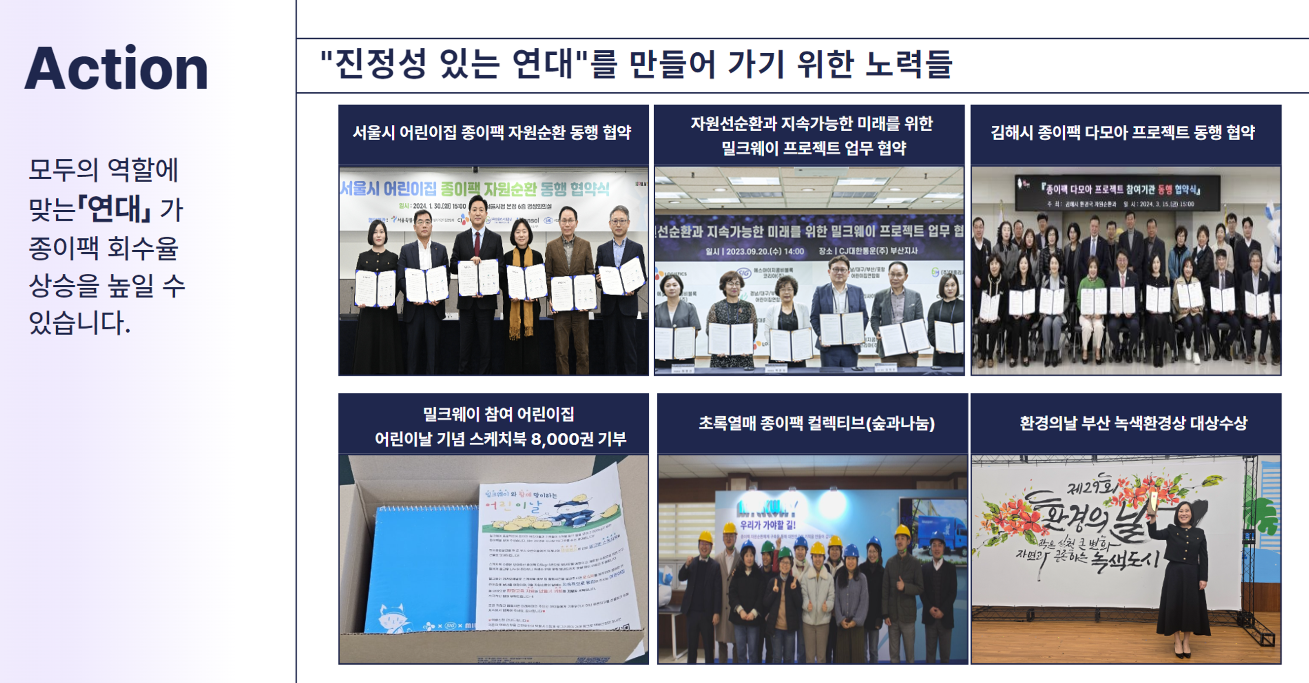 이것은 올바른 종이팩 자원 선순환이라는 공통적인 목표를 가진 기업 및 기관과의 협업이 있었고, 우리 환경을 생각하는 깨어있는 배출자분들이 다소의 불편함과 번거로움을 감수해가면서 함께 했기에 가능한 일이었습니다.