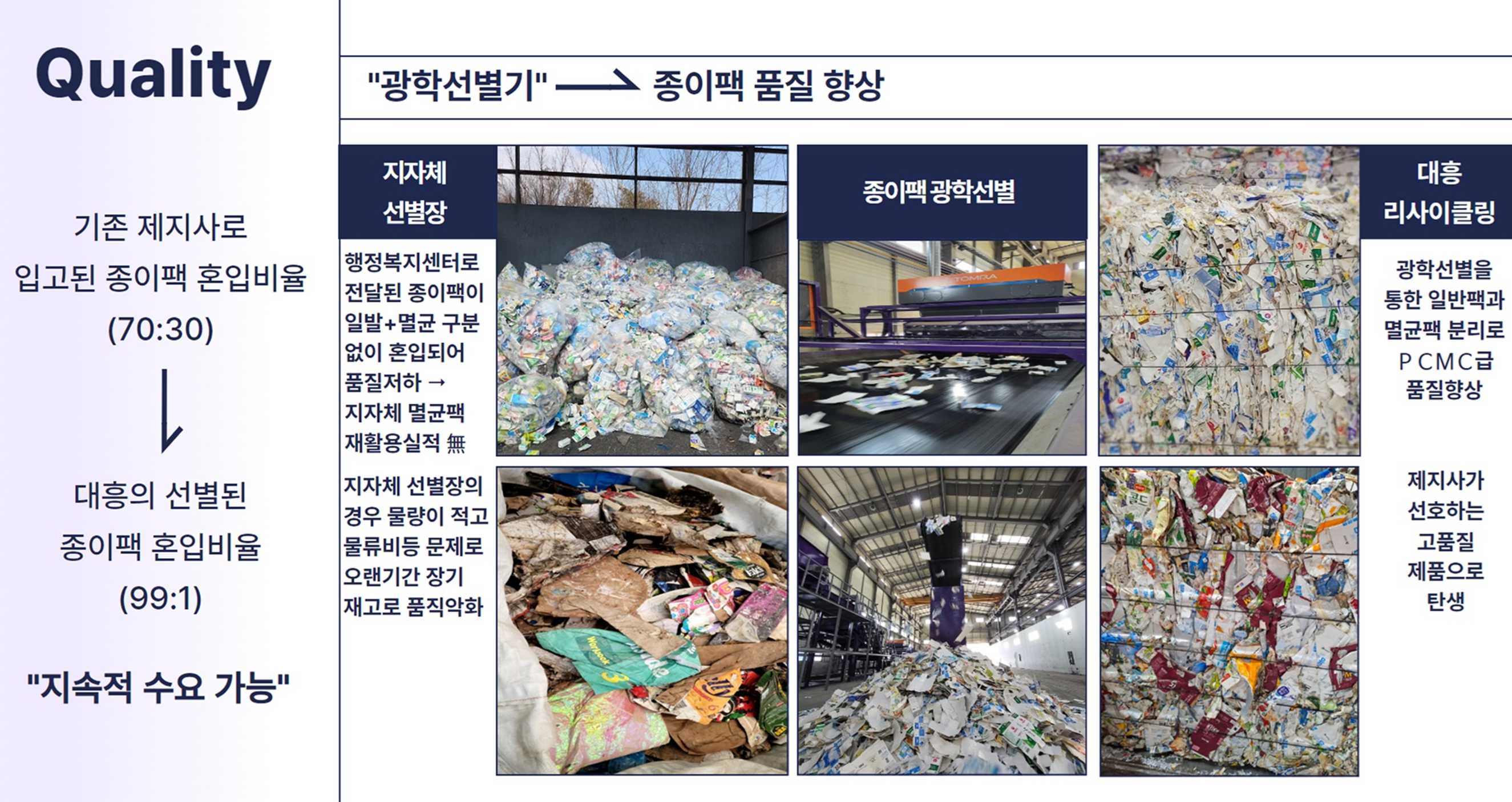 또한 다른 재질로 코팅처리된 멸균팩이 일반 종이팩에 섞이게 되면 그것을 골라내는 것이 문제였고 한 두 개만 섞이더라도 최종 제품에 불량을 발생하는 치명적인 문제가 있었기에 우리는 회수용기를 제작ㆍ공급하여 분리 수거를 진행하였고, 그렇게 해도 섞여 있는 멸균팩은 국내 최초로 광학선별기를 제작하여 선별작업을 빠르고 정확하게 해내고 있습니다.