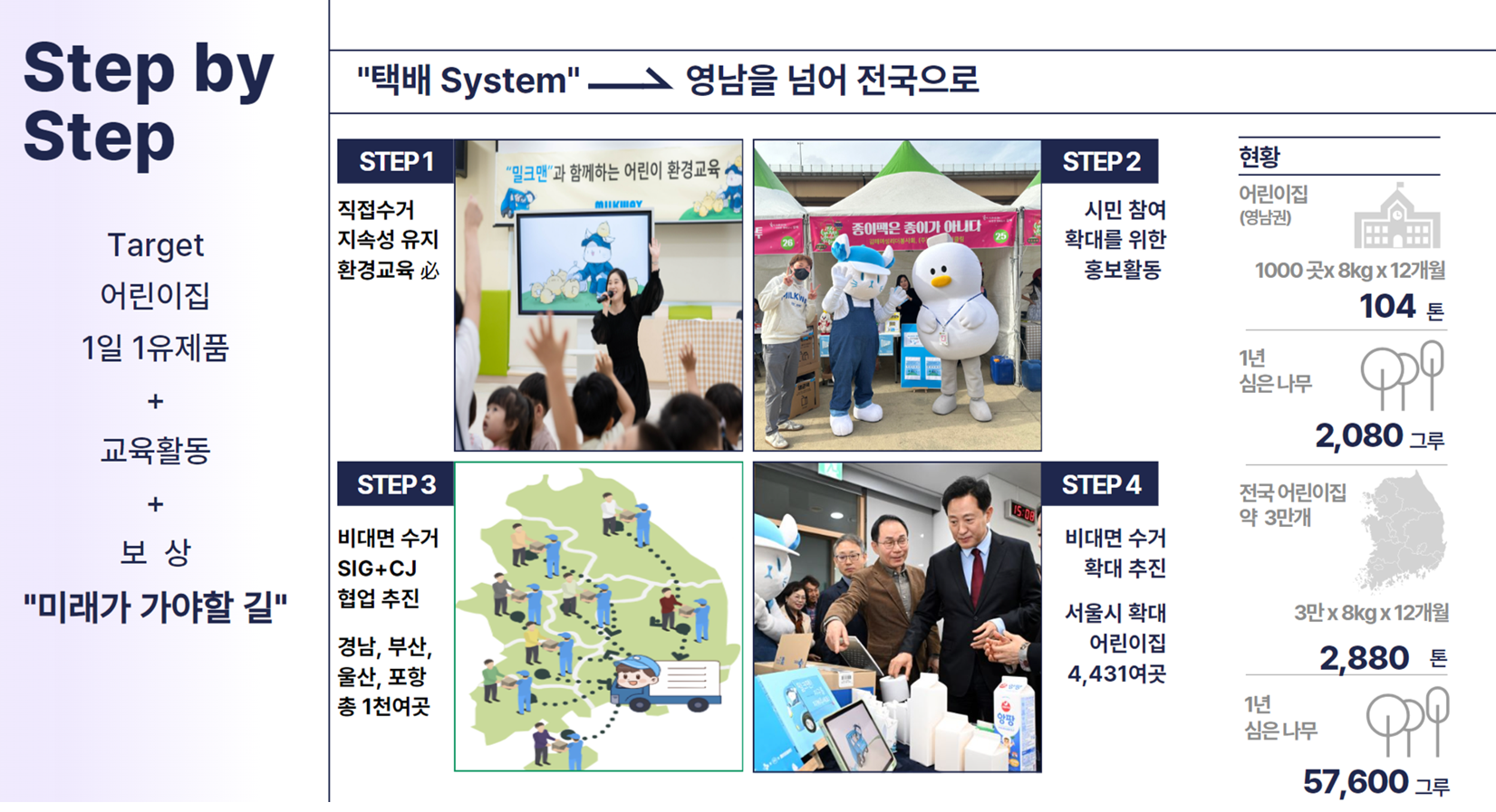 초창기 밀크카(전기차) 두 대로 직접 수거하던 밀크웨이 프로젝트는 영남권으로 확대되었으며, CJ대한통운과 SIG콤비블록과의 협업 아래 택배 수거 방식으로 이원화되어 현재는 전국의 종이팩을 수거하고 있습니다.