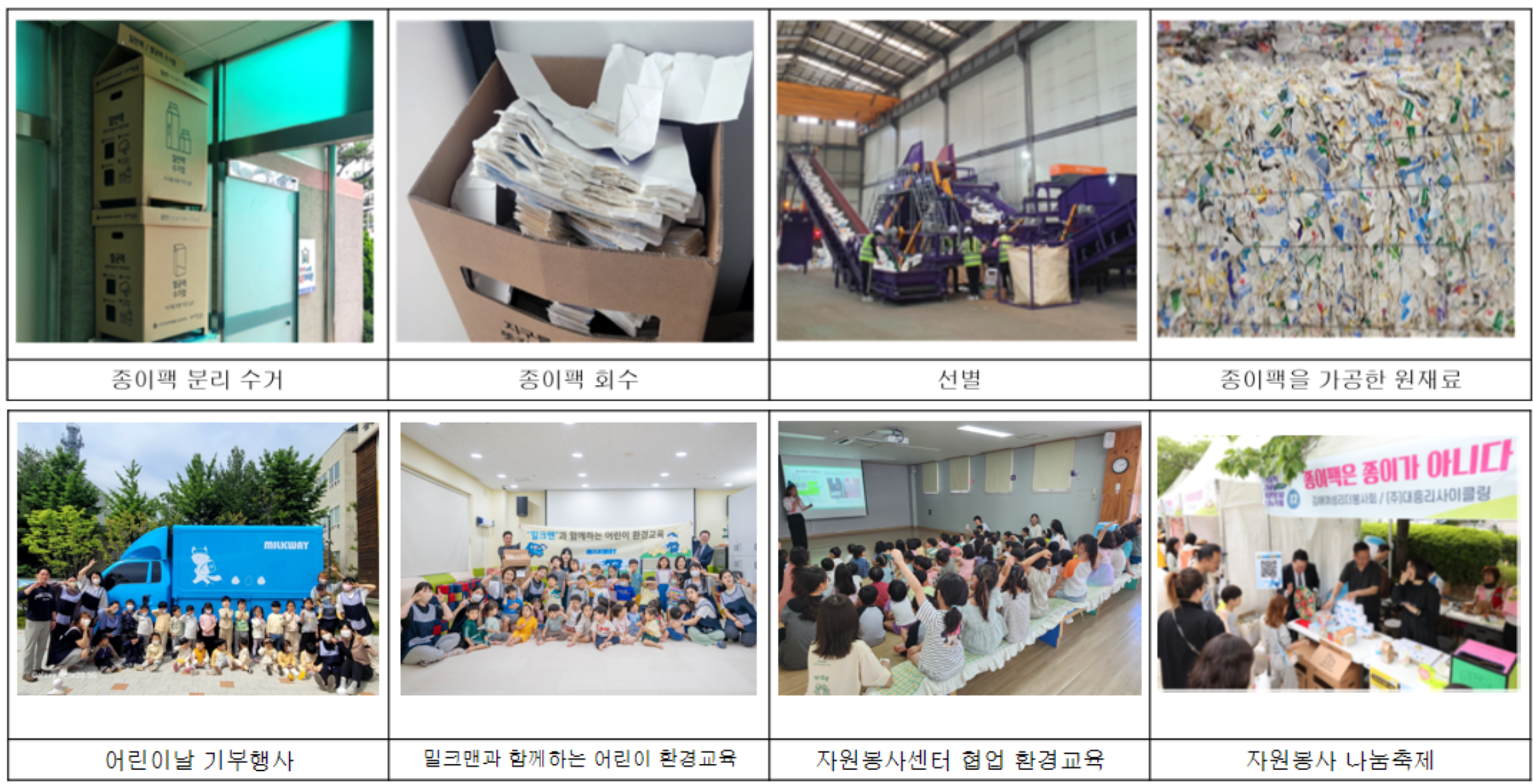 환경교육의 일환인 자체제작 동화를 E-Book으로 제작하여 참여 기관에 기부하였고, 종이팩 1kg당 재생휴지 1롤 제공, 어린이집에 스케치북 기부, 재생용지를 활용한 어린이 교육키트 제작 공모전 개최, 인공지능을 접목해 영상으로 만나는 전자 동화책 제작, 종이팩 배출 우수 어린이집 표창 등 다양한 보상 활동을 이어가고 있습니다.