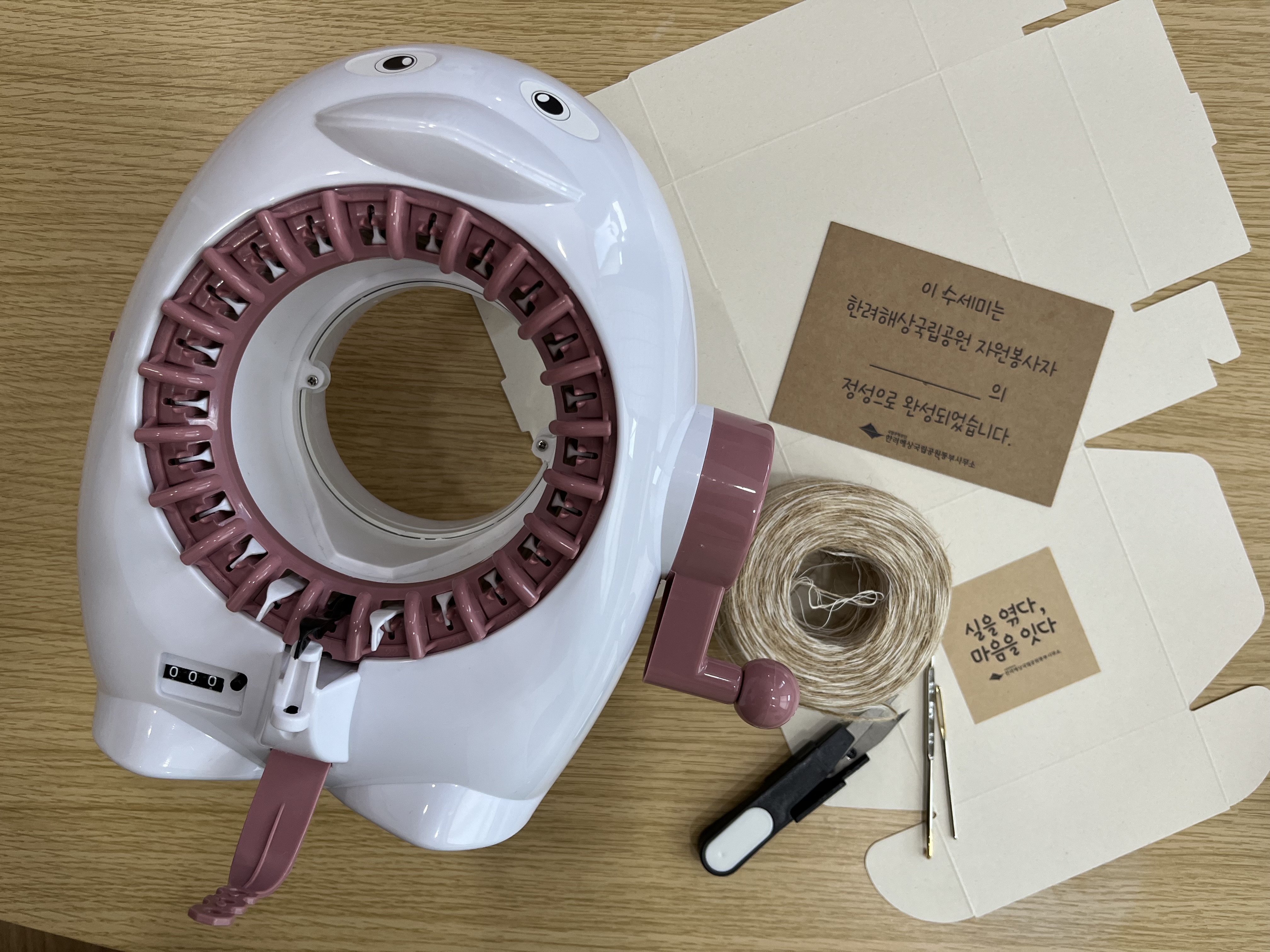 뜨개질을 할 수 있는 자원봉사자는 손뜨개로 수세미를 만들고 뜨개질에 능숙하지 않은 자원봉사자는 자동 뜨개질 기계를 사용하여 수세미를 제작했습니다.