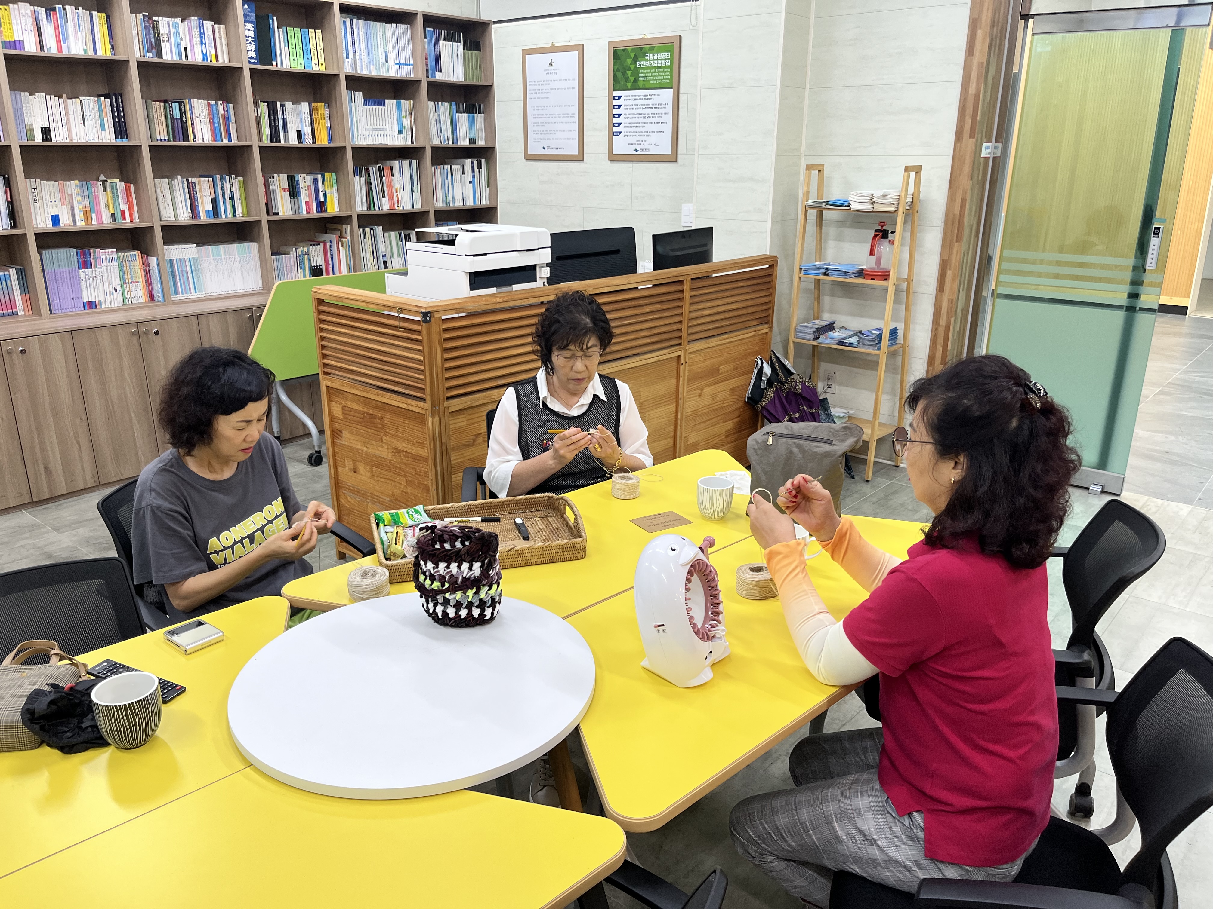 자원봉사자들이 한려해상국립공원동부사무소 내 위치한 자원봉사센터에서 친환경 실로 수세미를 만들고,
