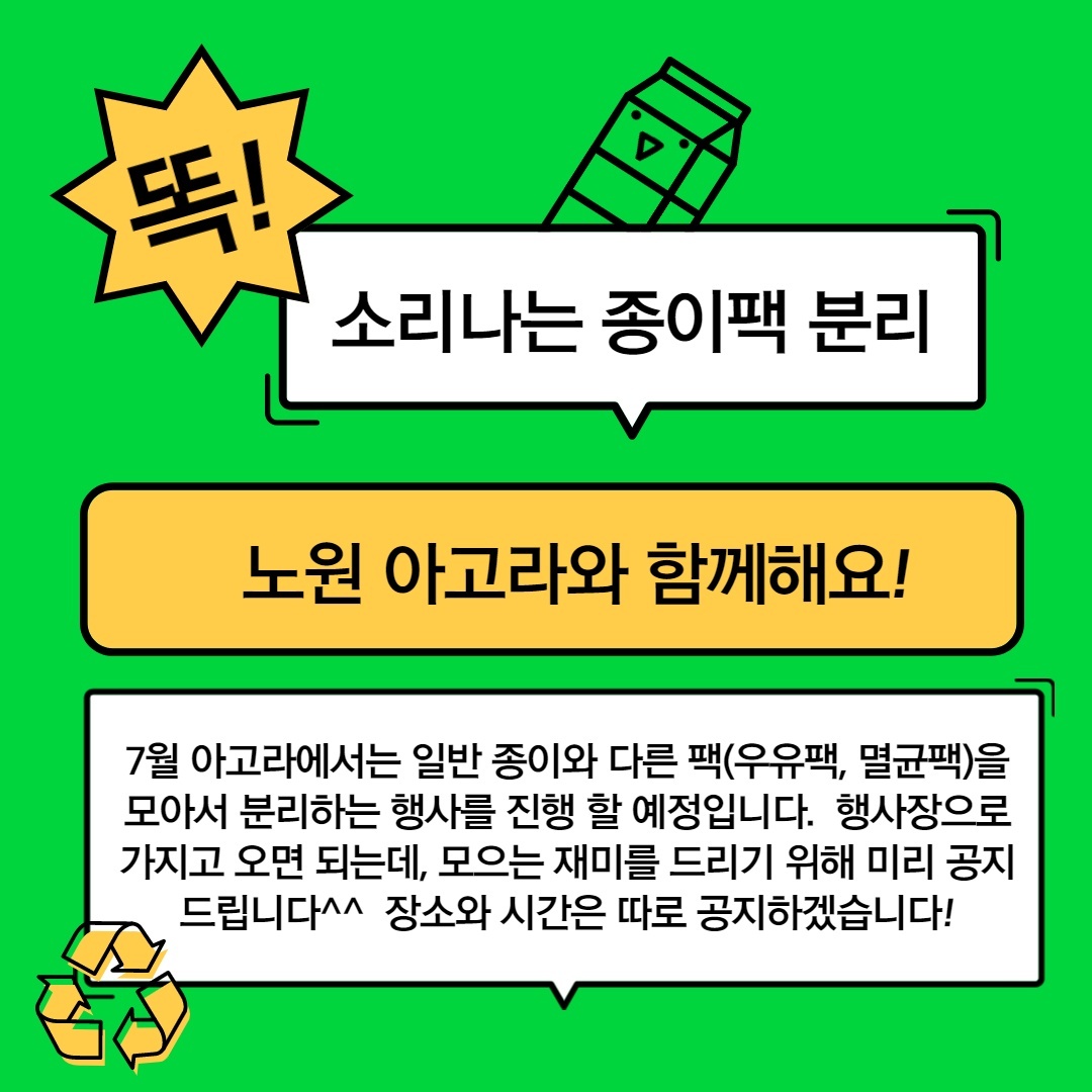 - 코로나 상황에서 모든 활동을 온라인으로 대체하기란 쉽지 않았습니다. 더욱이 사람과의 만남을 통해 효율성이 극대화되는 마을활동의 경우(자원봉사도 포함)는 열심히 준비해서 진행해도 왠지 부족함이 많이 느껴지는 듯했습니다. 아마도 직접 눈으로 확인하지 못하는 답답함도 있었기 때문은 아니었을까 싶어요. 7월 아고라에선 '똑소리나는 종이팩 수거'를 해서 만나기로 했는데 코로나 확산세가 심해 결국 8월로 활동이 미뤄지게 되는 상황이 발생했습니다.