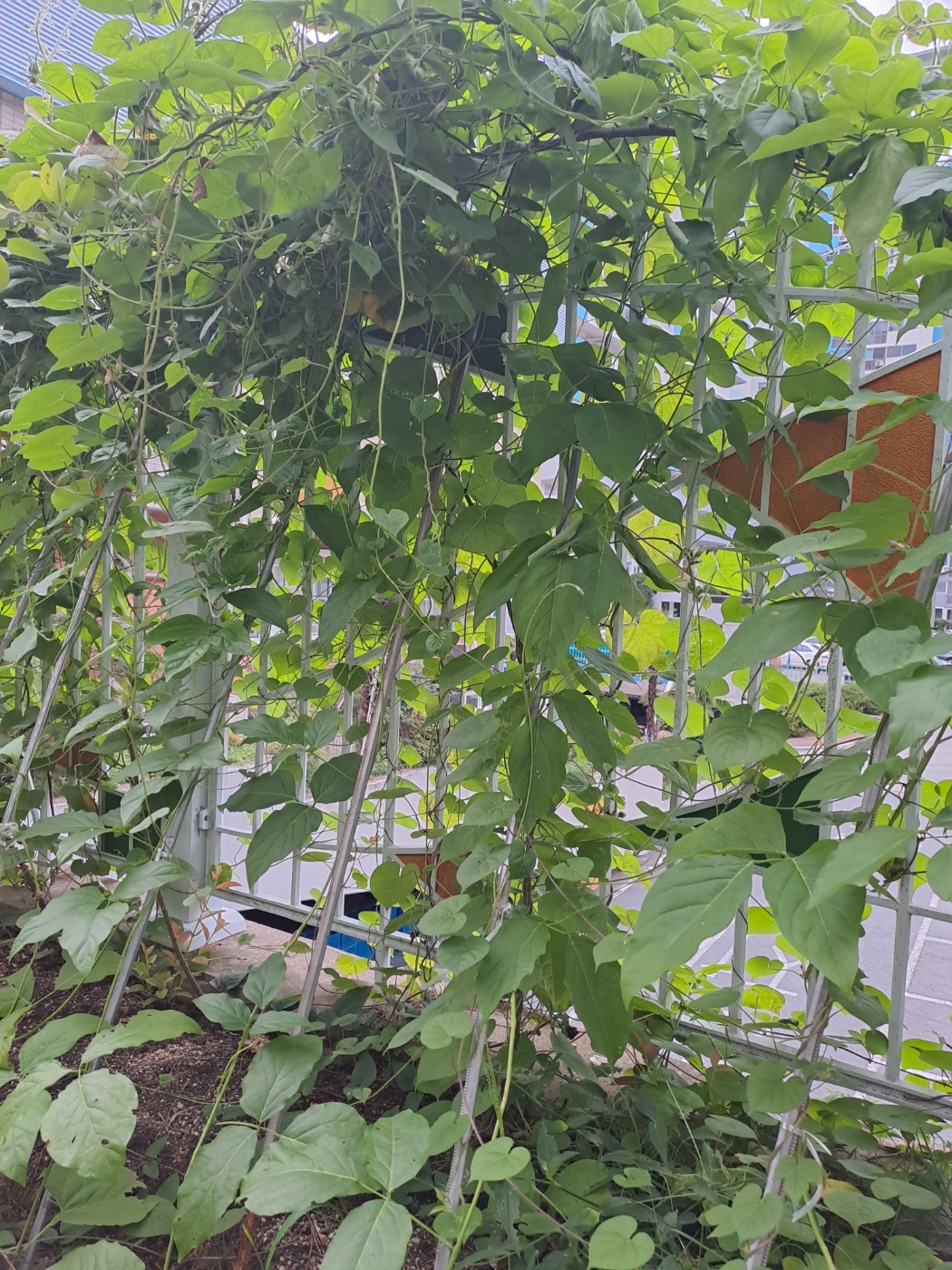 빈벽면, 자투리땅, 지붕, 운동장 귀퉁이 어디에나 줄기식물을 심어 그린커튼을 만들어 탄소중립과 이산화탄소 배출을 줄이고 온실효과를 줄여나간다.