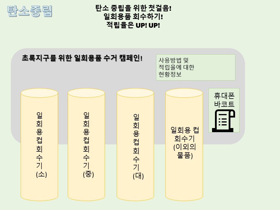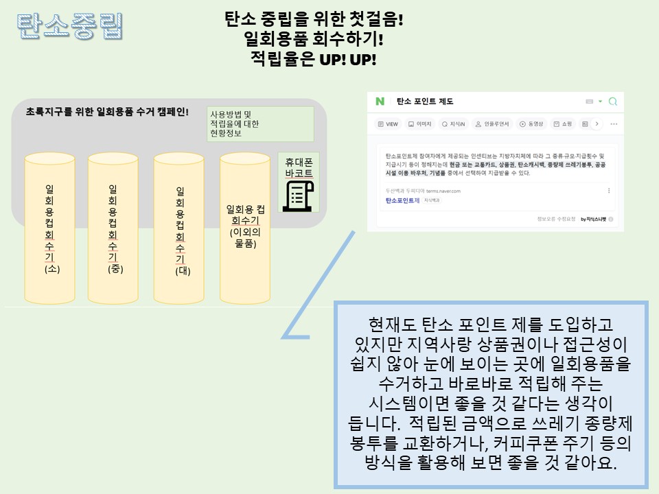 지금도 탄소 포인트 제도가 있지만 알지 못해서, 또 어떻게 활용하는지 몰라서 안하시는 분들이 대부분 이더라구요. 그리고 적립이 된다고 해고 쉽게 사용처를 알지 못하는 경우도 많은 것 같아요. 저는 휴대폰 번호로 간단하게 로그인을 하면 좋을 것 같다고 생각을 했어요. 그리고 이 아이디어를 생각하면서 가장 크게 드는 생각이 눈에 보이는 곳에 올바른 분리수거 장치를 설치하고, 일회용 테이크아웃 컵을 분리수거 후, 적립되면 바로바로 보상이 이루어 지면 좋겠다는 생각이요. 기계를 설치하거나, 기존에 있던 분리수거 통을 활용해 봐도 좋을 것 같고, 더불에 분리수거 후 바로바로 적립하는 시스템일 실행되면 좋을 것 같습니다. 그리고 더불어 적립 후, 탄소포인트 제 회원가입을 대상으로 카페에 10번 방문 중 8회 이상 텀블러 사용시 커피 쿠폰 증정 등의 보상심리를 활용해 보아도 좋을 것 같아요.