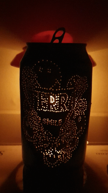 캔맥주른 다 마신 후 깨끗이 세척해 송곳으로 표현하고 싶은 모양을 뚫어 주었어요. 그리고 뒷면을 자른 후 조명을 넣어 주었어요.