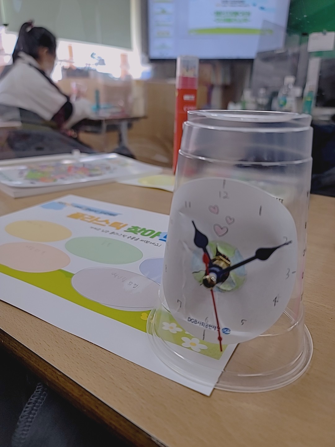 일회용 플라스틱컵을 활용하여 탁상 시계를 만들었습니다.